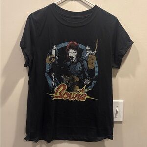 Show your love for one of the most iconic rock musicians ever! This sleek retro inspired David Bowie tee features a photo graphic of the artist himself with the band and his name underneath. Made with soft cotton fabric, distressed hems, cuffed short sleeves, a ribbed crew neckline, and a fitted silhouette.