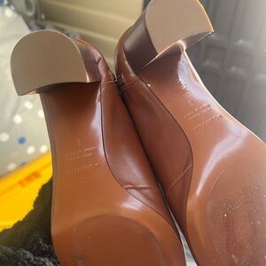 Opened up inside zip peep-toe granny book on a leather stacked heel.