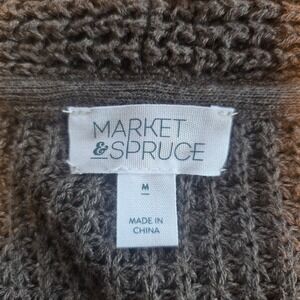 The Market & Spruce Chocolate Wide Knit Open Front Cardigan Sweater in women's size medium is a stylish and cozy addition to any wardrobe. Made from a wool and cotton blend with a wide knit pattern, this sweater features a relaxed fit and long sleeves for added comfort. The open front design and oversized style make it perfect for travel or casual occasions during the winter, fall, or spring. Easy to care for with machine washable fabric, this cardigan is a versatile and fashionable choice for any woman's closet.