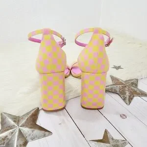Gianni Bini Maileigh Checkered Satin Ankle Strap Block Heels green pink size 8.5