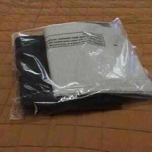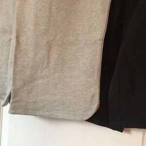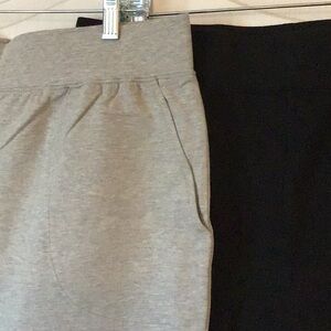 Pull on style, elastic waistband, slash pockets, curved hem. French terry. Inseam 11”. One light grey pair and one black pair. NEW