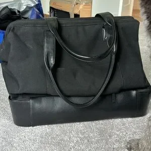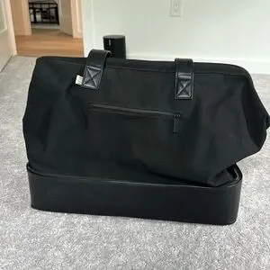 Spacious BEIS weekender for travel. Top zip closure and exterior zip pocket. Leather-look base and handles. Lightweight and packable. Simple, versatile design for trips.