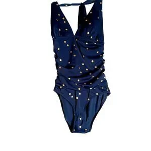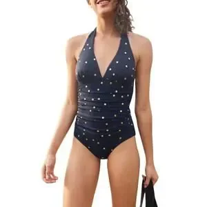 Boden navy blue and gold polka dot halterneck one-piece swimsuit. US 8