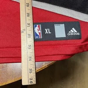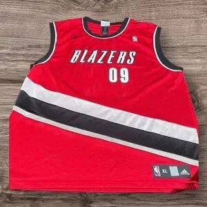 Adidas Portland Trailblazers Red and Black Jersey Bold red Adidas Blazers jersey. Features black and white stripes. Ideal for basketball enthusiasts. This jersey is in great shape for his age and perfect for the Portland trailblazer fan out there.