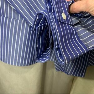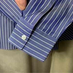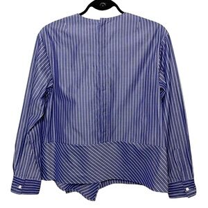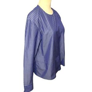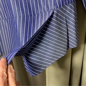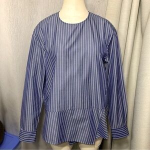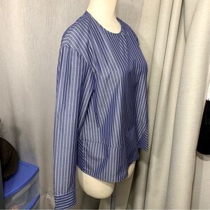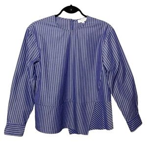 In excellent condition. Japanese luxurious brand. Well made 100% cotton and lightweight. Contemporary, Minimalist blouse. Shimmery blue with vertical stripes. Hidden button in the back. Crew/round neckline. Long classic sleeve with button. Asymmetric hem. Great casual dress, career, office wear. **This is a sample**