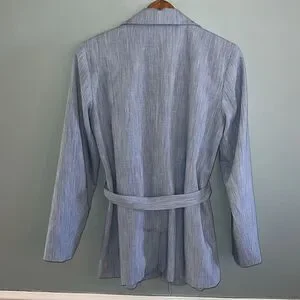 The single breasted blazer has a tie waist, one button and is single breasted.