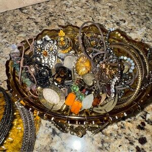 Vintage Fenton Amber Glass Candy Dish Mystery Jewelry Jar! Filled with bronze and antiqued tones of all wearable beautiful jewelry. Please note candy dish is imperfect and has 2 small chips that I noted. Jewelry will be packed outside of dish and dish will be carefully wrapped and separate to ensure proper shipping.