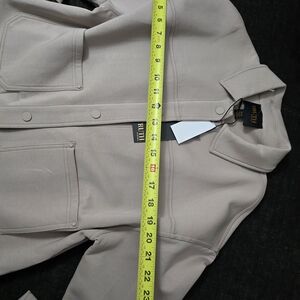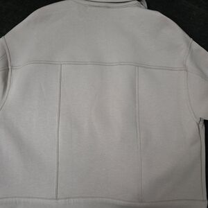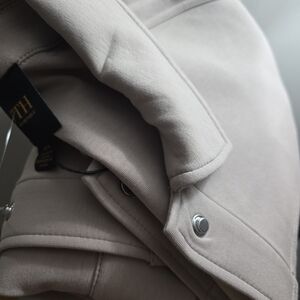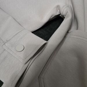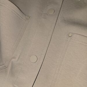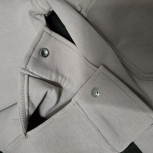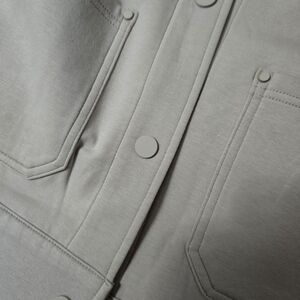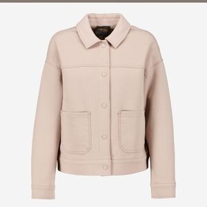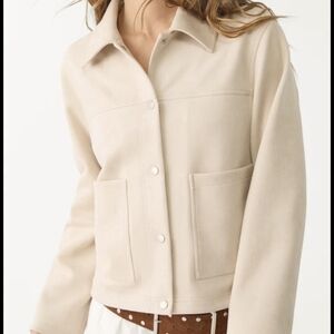 Soft cream jean jacket with a classic collar. Snap-button front for easy wear. Large patch pockets at the hips. Straight hem and simple seams for a clean look.