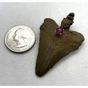 Vintage Bronze Coated Megalodon (?) Tooth Pendant Genuine Tourmaline Accent OOAK