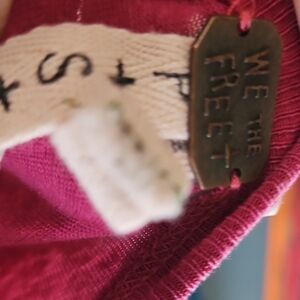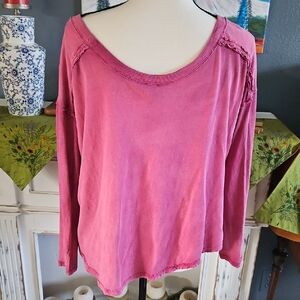 Free People We The Free pink long sleeve top offers a relaxed, bohemian aesthetic with unique lace-up shoulder details and grommet accents. Crafted from a soft, lightweight knit with a subtle burnout texture, it features a wide scoop neckline, raw-edge seams, and a high-low hemline with side slits for a comfortable, lived-in feel. The vibrant magenta hue and distressed finish make it a versatile piece for layering or wearing on its own.