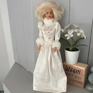 Outfit is Not Original - it’s a 1990s Barbie fashion avenue dress with a gold snowflake but this Barbie pulls off the elegant style nicely.