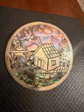Vintage Taxco Mexico Sterling Silver Brooch Pendant, featuring a stunning Abalone Inlay with a traditional Mexican landscape scene including a casita and figure. This versatile dual-purpose piece includes both a pin back and a pendant bale for weaing on a chain. Handcrafted in Mexico with authentic Taxco hallmarks. High-quality colorful iridescent abalone shell mosaic. Good vintage condition with some natural patina on the sterling silver that can be polished if desired. Small chip visible on the lower edge of the shell inlay. Perfect for collectors of Mexican silver jewelry.