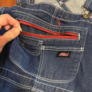 Genuine Dickies relaxed fit denim bib overalls in a deep indigo rinse. Features a multi-compartment bib pocket with a signature red zipper detail, adjustable shoulder straps, and durable triple-needle stitching throughout. Includes functional hammer loop and multiple utility tool pockets. Heavyweight 100% cotton denim built for work or casual streetwear styling.