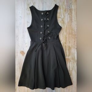 Chic black mini dress with a textured finish. Sleeveless design. Keyhole back with tie closure. Perfect for any occasion. Very cute on! Only worn once or twice. Polyester and spandex