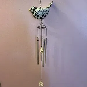 These weather-resistant chimes feature metal pipes that are hung from a checked bird, trimmed with toile wings.