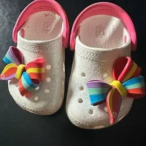 Adorable kids clogs featuring a vibrant rainbow bow. Perfect for playful adventures.