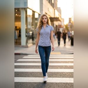 Branding: Iconic gold "GUESS" plate on the lower side hem.