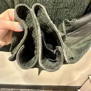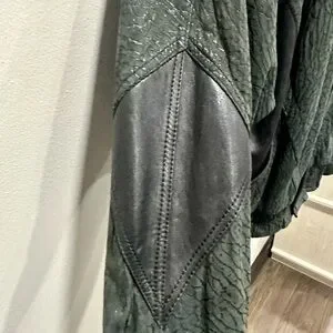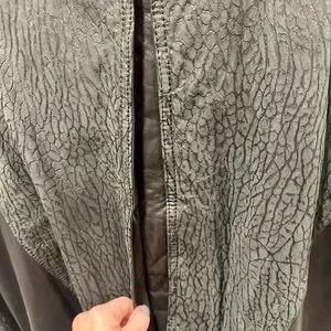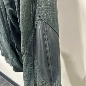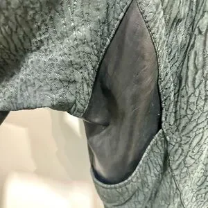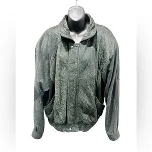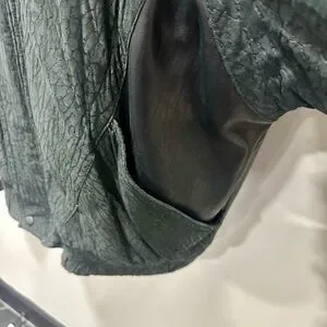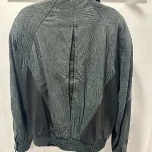 Stylish black bomber jacket with unique texture. Features sleek design and comfortable fit. Ideal for versatile wear. Very good pre-owned condition. Some signs of wear on the left cuff (see pics). Very durable with two outside pockets and one inside pocket. Built in shoulder pads. Shell is 100% leather, lining is acetate.