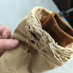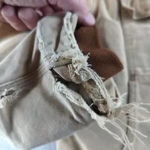 Pre-owned jacket with heavy wash wear and a distressed, broken-in feel. There is significant fraying and tearing at both sleeve cuffs. Multiple small stains and faded marks are visible on the front body and sleeves. Fabric otherwise intact; zipper, pockets, and hood are secure and functional.