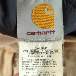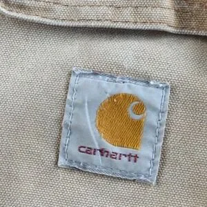 Branding: Classic square Carhartt logo patch on the left chest pocket and a branded zipper pull.