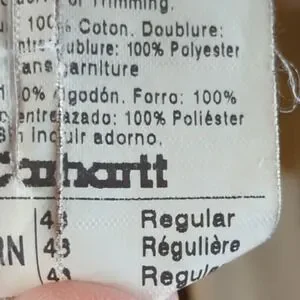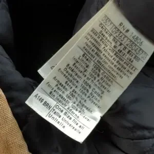 Material/Fabric: The shell is 100% Cotton duck canvas for durability, with a 100% Nylon lining and 100% Polyester interlining for insulation.