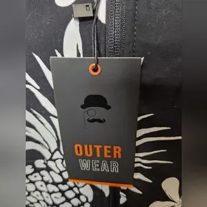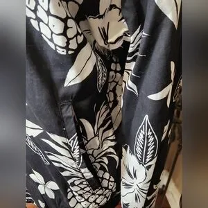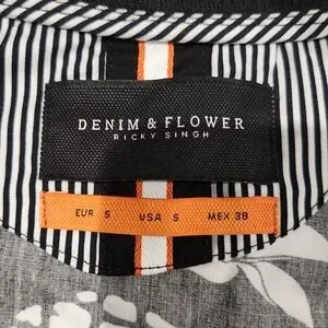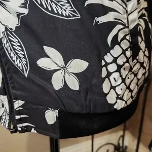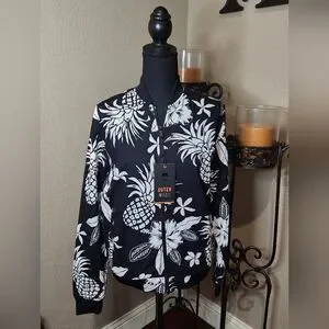 Stylish Denim and Flower black and white bomber jacket with floral and pineapple print. Perfect for casual outings. Lightweight. 2 outside pockets and 4 inner pockets. Size small. NWT. Smoke-free, pet-free home.