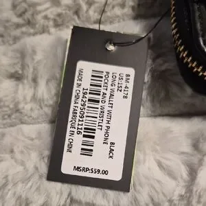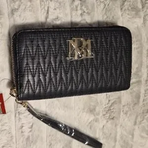 Stylish black quilted wallet featuring a gold logo. Includes a wrist strap for convenience.