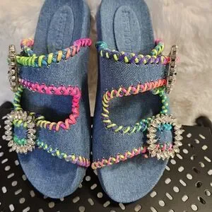 Brand New Without Box (NWOB)! Handcrafted luxury denim slides with dazzling crystal buckles.