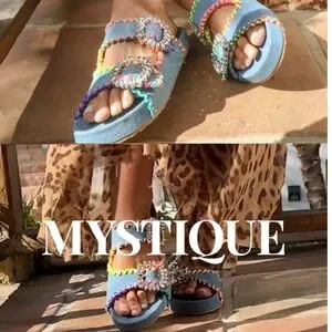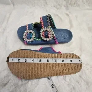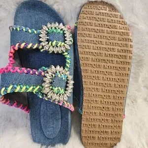 Mystique Luxury Denim Slides Sandals Crystal Buckle Size 8.5 (Fit 8-8.5) NWOB