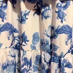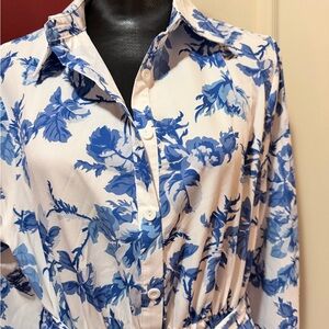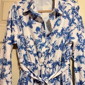 A lightweight white maxi dress with an allover blue floral print. Features a button-front bodice, long sleeves, and a self-tie waist for a flattering silhouette. Versatile and breathable for daytime wear.