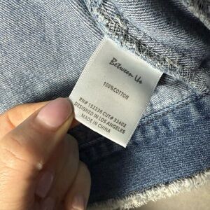 Unique distressed denim jacket from Between Us featuring an abstract painted portrait on the back. Perfect statement piece for festival outfits, indie streetwear, or grunge inspired styling. A wearable art jacket that adds personality to any casual look.