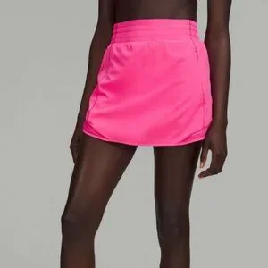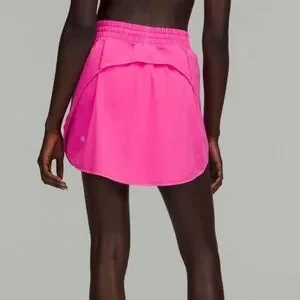 Bright hot pink athletic skort by lululemon athletica. Smooth stretch fabric with integrated liner. Elastic waistband with drawcord for a secure fit. Subtle side seam and curved hem for movement. Ideal for running or gym sessions.