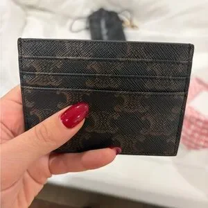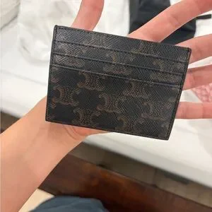 Stylish Celine card holder in black and brown. Features iconic gold logo. Ideal for chic organization.