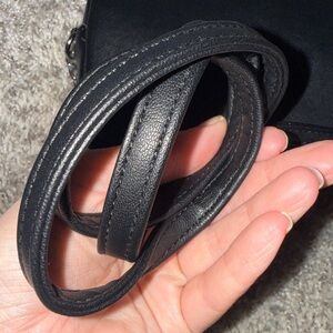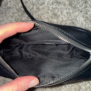 This chic black quilted crossbody bag is perfect for any occasion. Its sleek design and versatile color make it a must-have accessory. It is in great to excellent preowned condition. Approximately 7“ x 5” x 2” and a strap drop of 21”.