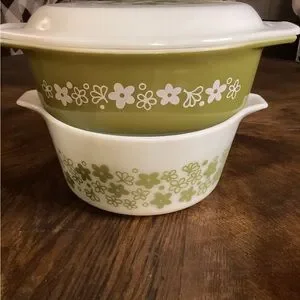 Pyrex Spring Blossom Crazy Daisy green/white casserole w/ lid & Bowl