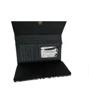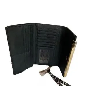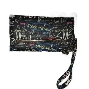 Stylish black wallet with vibrant multicolor graphics. Features bold Steve Madden branding. Includes wrist strap for convenience.