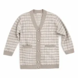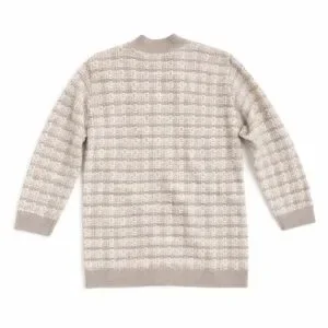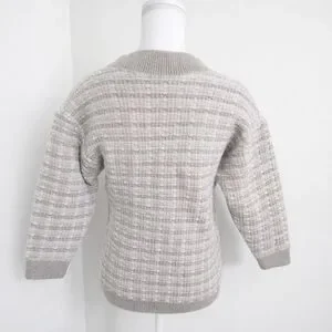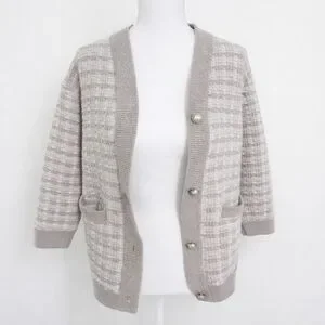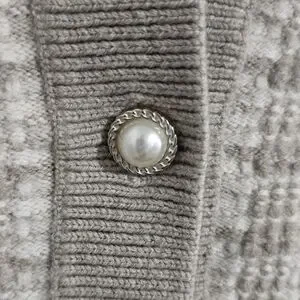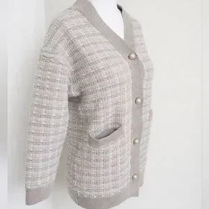 Heathered grey and white tweed knit with taupe trim and pearl buttons.