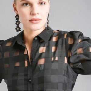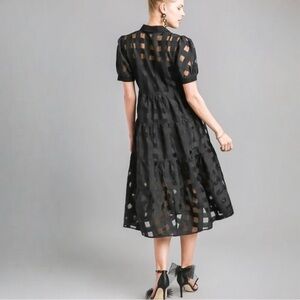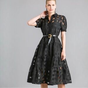 This gorgeous & glamorous organza basket weave dress is giving me a modern twist on Breakfast at Tiffanys with its collared neckline and short puff sleeve. The button-down design adds a classic element to the garment. The dress is made from a beautiful basket weave organza fabric that is delicate and lightweight. Sleek and elegant and perfect for date night or drinks out with the girls. Elevated office attire. Beautiful!