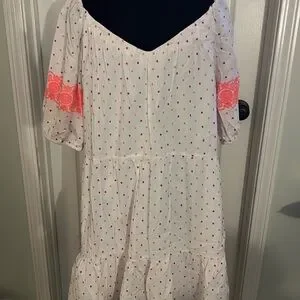Lightweight white knee length dress by LOFT. Scattered colored polka dots. Coral lace trim on sleeves. Scoop neckline and tiered skirt. Casual and feminine look perfect for the spring and summer. This is NWOT, from a smoke free home.