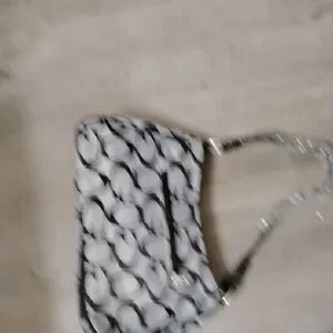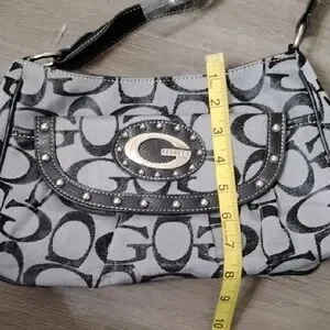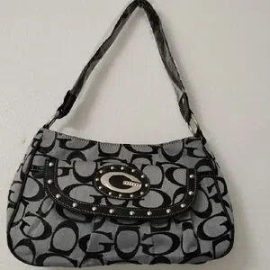Guess Black and Gray Signature Canvas Shoulder Bag with Studded Flap