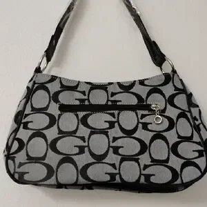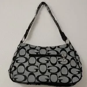 Guess signature canvas shoulder bag in black and gray. Front flap with stud detailing and metal logo plaque. Single shoulder strap for easy carry. Chic, casual style for daily use.