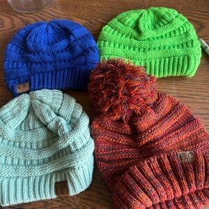 Four cozy knit beanies by C.C. Includes solid royal blue, bright lime green, soft mint, and a multicolor orange pom beanie. Stretchy ribbed bands for easy fit. Soft knit ideal for everyday wear.
