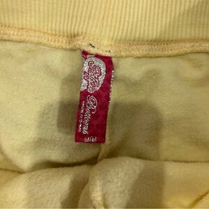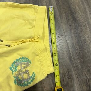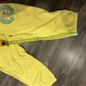 Comfortable yellow jogger pants with elastic waist and drawstring. Features a green laurel wreath and logo print. Soft, easy-care fabric designed for everyday play.