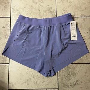 Soft lavender active shorts. Elastic waistband for easy wear. Layered hem with subtle side slit. Comes with original brand tag attached.