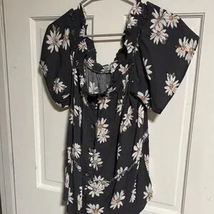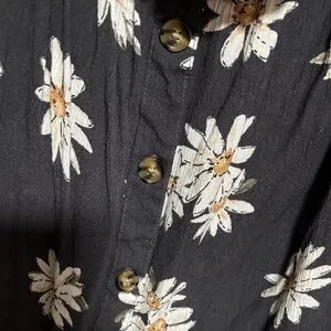 Lightweight black blouse with white daisy print. Puff sleeves and a ruffled neckline. Front button details for easy styling. Feminine and versatile for casual looks.
