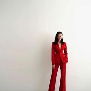 Sophisticated red tailored pantsuit with a structured blazer and long-leg trousers. Designed for a sleek, confident silhouette. Versatile for work or evening events. Red color adds bold, modern appeal.