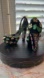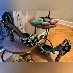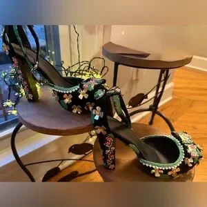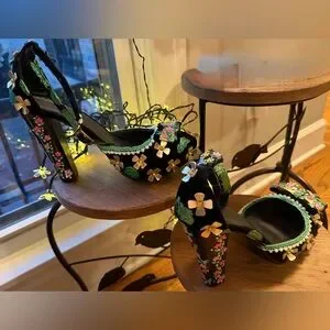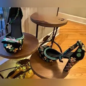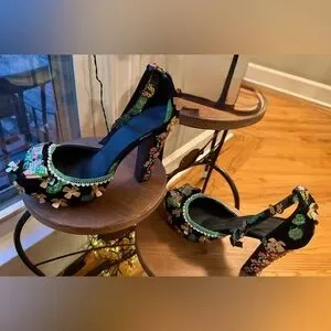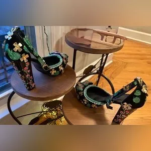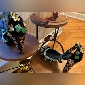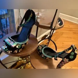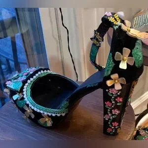 One~of~a~kind, custom embellished💐💕. Ankle strap for security. Step out in style with these elegant, black, platform heels with gold flower embellishments, flower and butterfly themed gems, green puff paint detailing, and white and green ribbon accents. Worn once, mostly indoors, so very little wear and excellent condition. Pretty comfortable for such a high heel, just too high with my chronic ankle issues 🤭. Stamped size 41, which the base shoe says is a US 9.5 and a UK 6.5, but the ankle strap allows for some flexibility—I am an 8/8.5 and these are fine for me with the ankle strap securing the shoe…