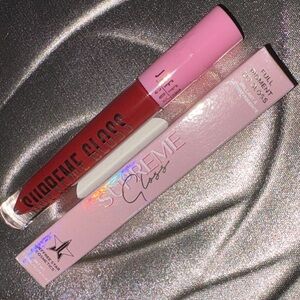 High-shine lip gloss with bold red pigment. Packaged with branded Jeffree Star box. Sleek tube with pink and red color accents. Perfect for a vibrant glossy finish. Brand Jeffree Star