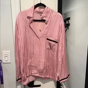 Soft pink satin button-up with subtle vertical stripes. All-over scripted Victoria's Secret logo. Classic collar and front button closure. Smooth, glossy finish for a luxe look.