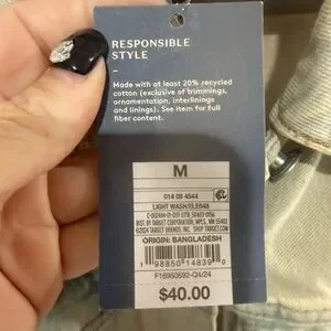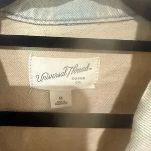 Universal Thread denim jacket in an olive green shade. Button-front closure with chest flap pockets. Adjustable drawstring waist for a tailored fit. Long sleeves with classic collar. Casual staple for layering.